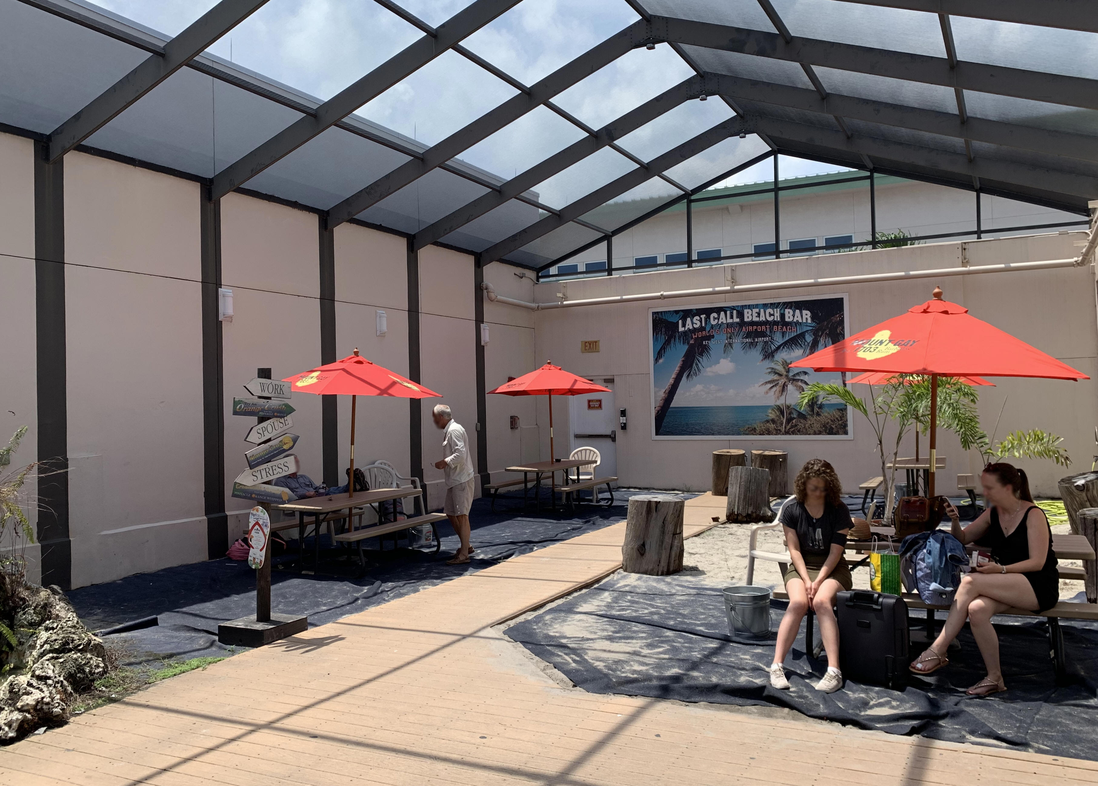 area in the terminal, outside, with sunshades benches